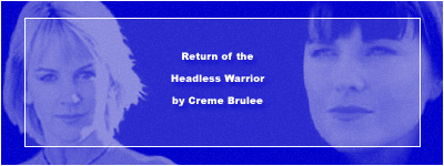 Xena nodded. "Which is exactly what the king said when he saw the warrior bend over and pick her head up off the ground. She placed it carefully out of the way, before starting up the fight again. The king used every dirty trick he could think of, he even tried kicking dirt in the warrior's eyes. He realized, too late, that he should have aimed the dirt at the severed head nearby, not the headless body that faced him in battle. That was his last mistake as our heroine took that opportunity to thrust her sword into the evil king's heart.